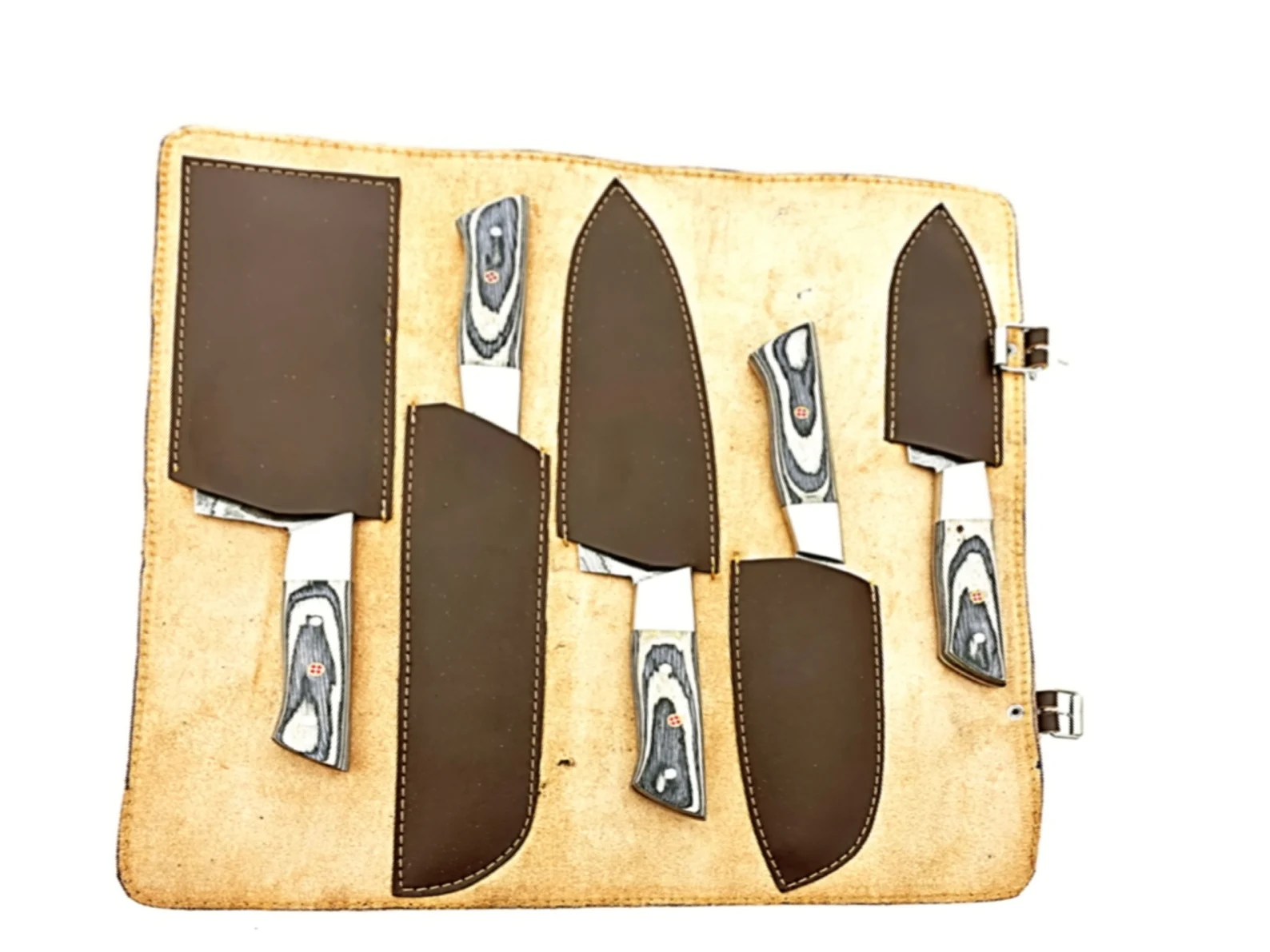 Crafted for professionals and kitchen enthusiasts, this 5-piece Damascus knife set features razor-sharp blades made from 15N20 and 1095 high-carbon steel. Each knife is paired with a durable Pakka wood handle and comes neatly packed in a premium leather roll bag for storage and travel.