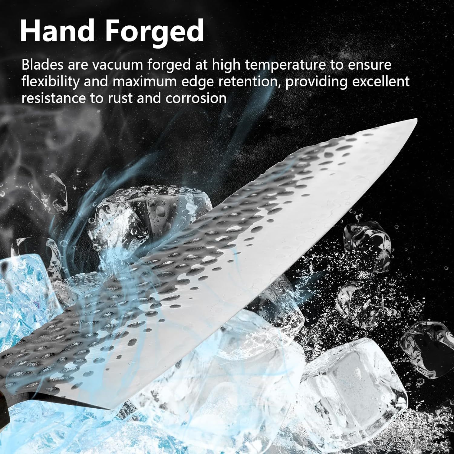 Built with triple-layered 9CR18MOV high-carbon steel, this 8-inch blade offers exceptional sharpness, edge retention, and resistance to rust. The hammered finish reduces food sticking, making prep fast and smooth.