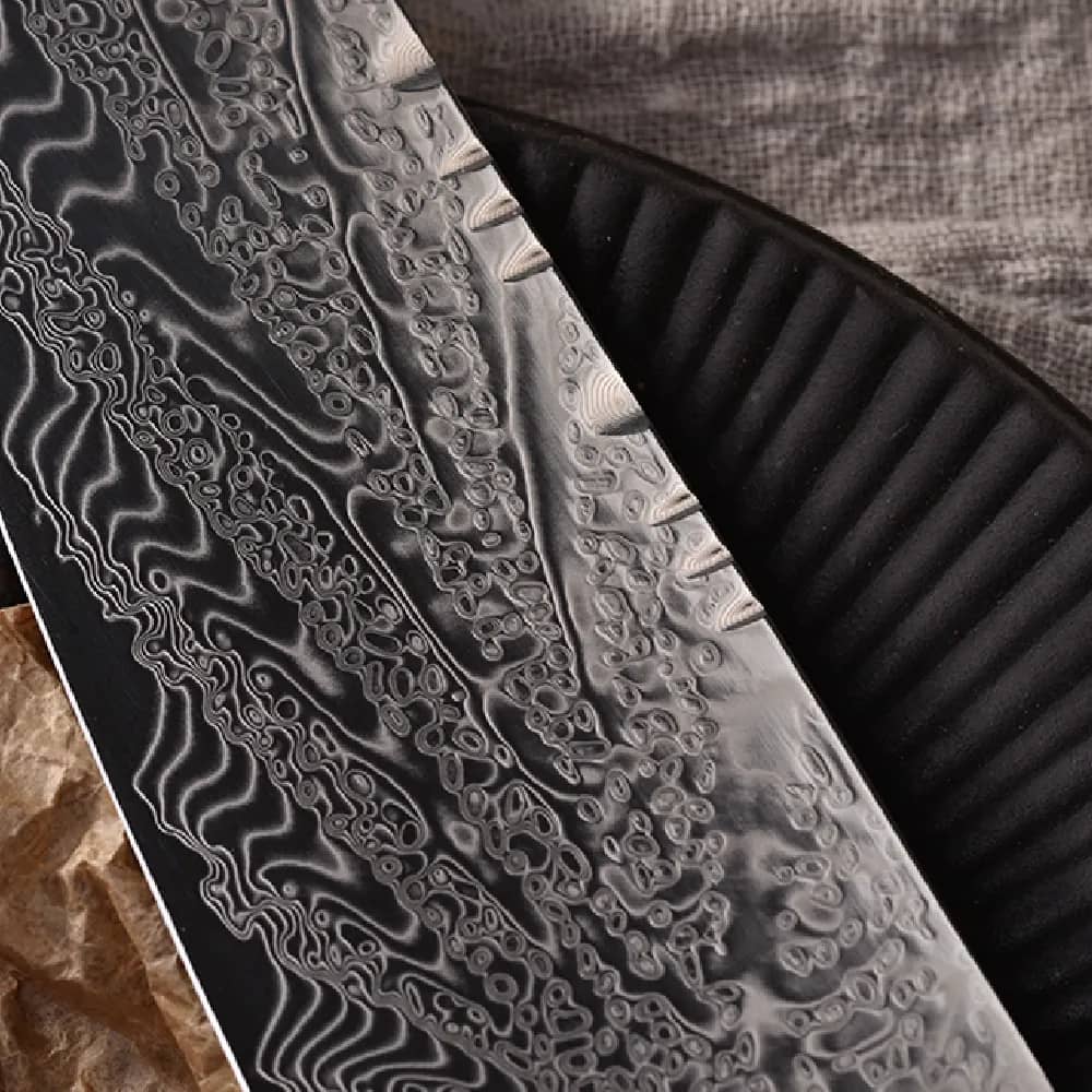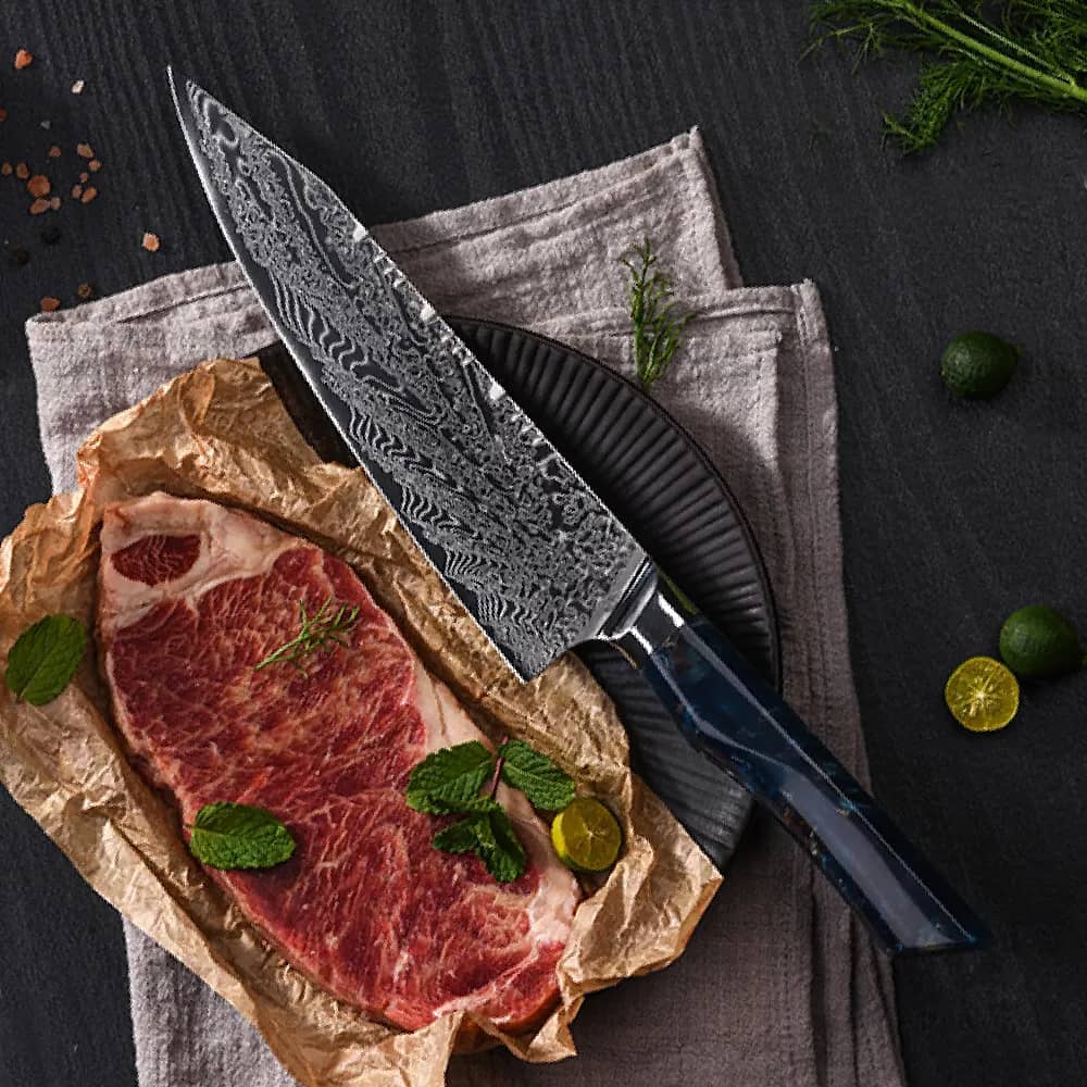 This knife is stunning and performs even better than it looks. Razor sharp, holds its edge well, and the 205mm size is perfect for everyday prep. The resin handle is comfortable, grippy, and adds a nice touch of style. Great balance, great quality — definitely worth it.